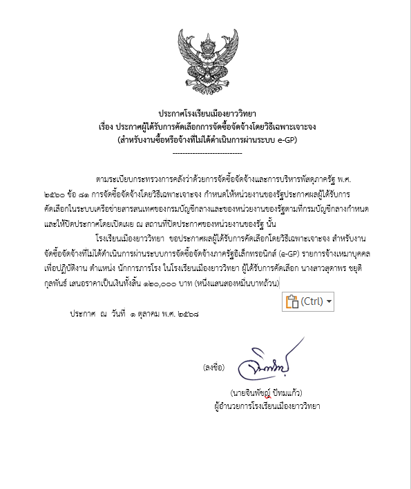 ประกาศโรงเรียนเมืองยาววิทยา เรื่อง ประกาศผู้ได้รับการคัดเลือกการจัดซื้อจัดจ้างโดยวิธีเฉพาะเจาะจง (สำหรับงานซื้อหรือจ้างที่ไม่ได้ดำเนินการผ่านระบบ e-GP)