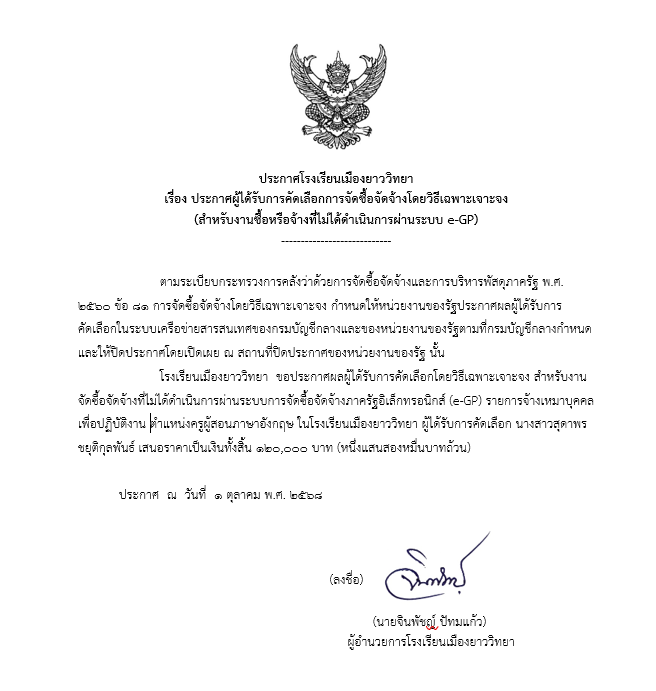 ประกาศโรงเรียนเมืองยาววิทยา เรื่อง ประกาศผู้ได้รับการคัดเลือกการจัดซื้อจัดจ้างโดยวิธีเฉพาะเจาะจง (สำหรับงานซื้อหรือจ้างที่ไม่ได้ดำเนินการผ่านระบบ e-GP)