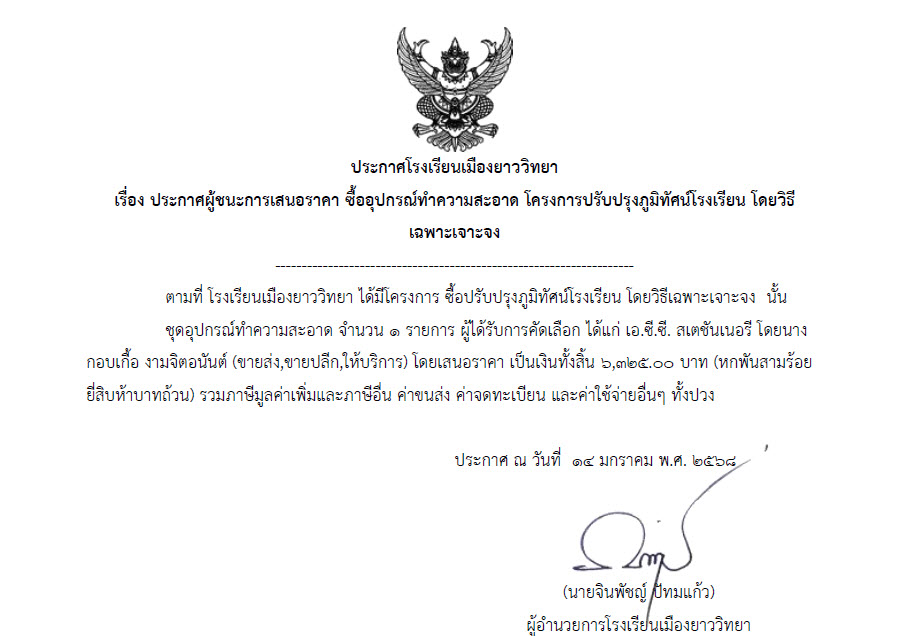 ประกาศผู้ชนะการเสนอราคา ซื้ออุปกรณ์ทำความสะอาด โครงการปรับปรุงภูมิทัศน์โรงเรียน โดยวิธีเฉพาะเจาะจง